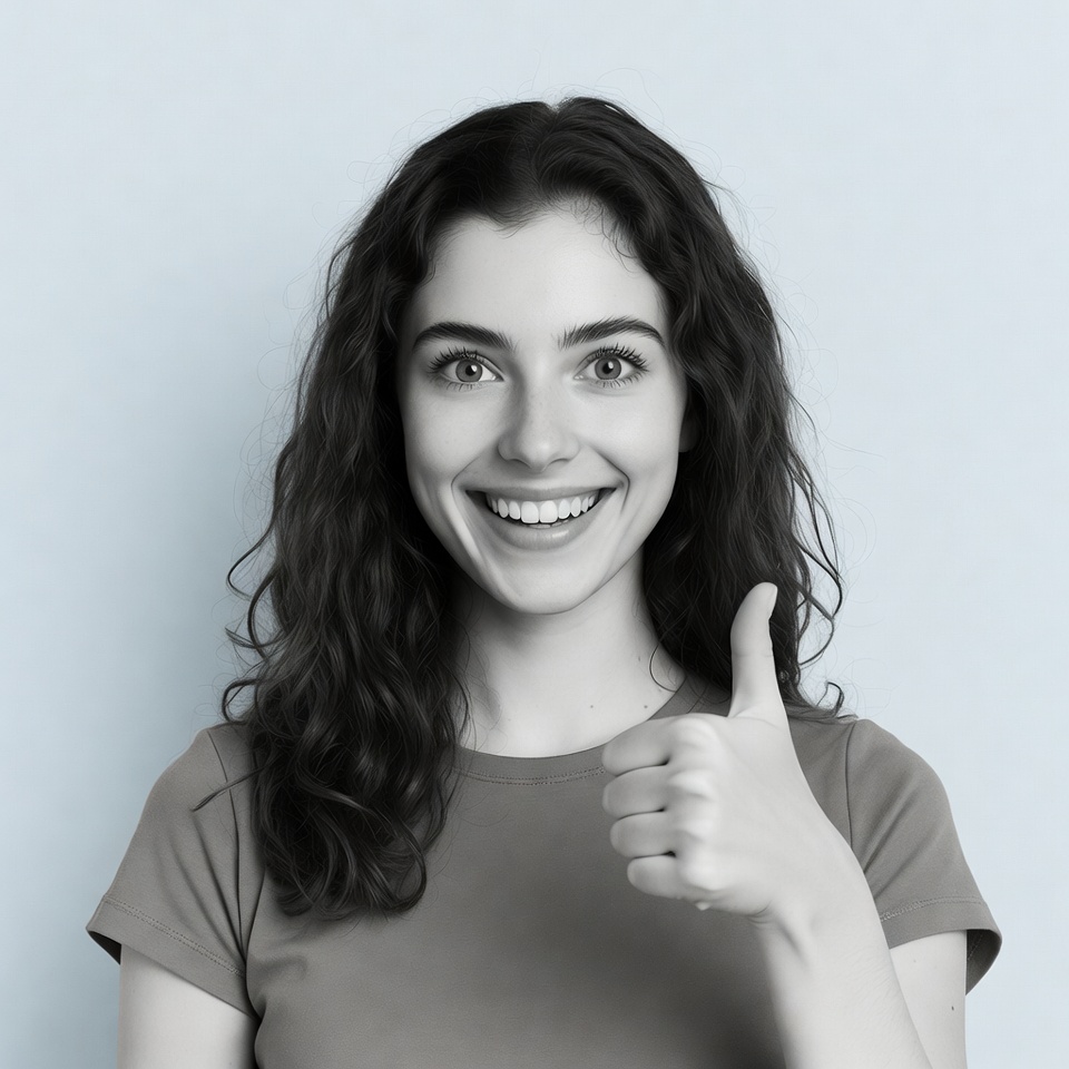 A woman smiles while giving a thumbs up. She has curly hair and wears a simple shirt against a light blue background.