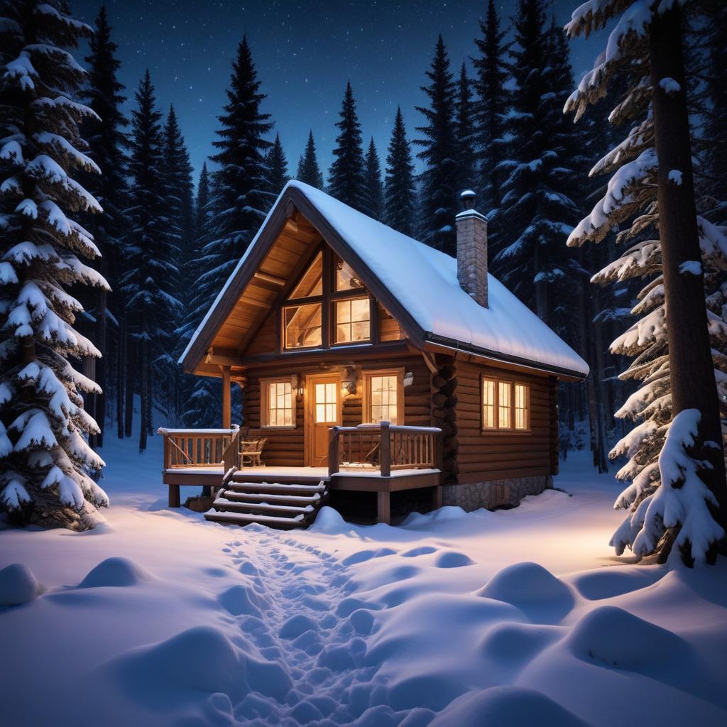 A wooden cabin sits surrounded by tall trees and snow. Soft light shines from the windows, inviting warmth on a cold winter night.
