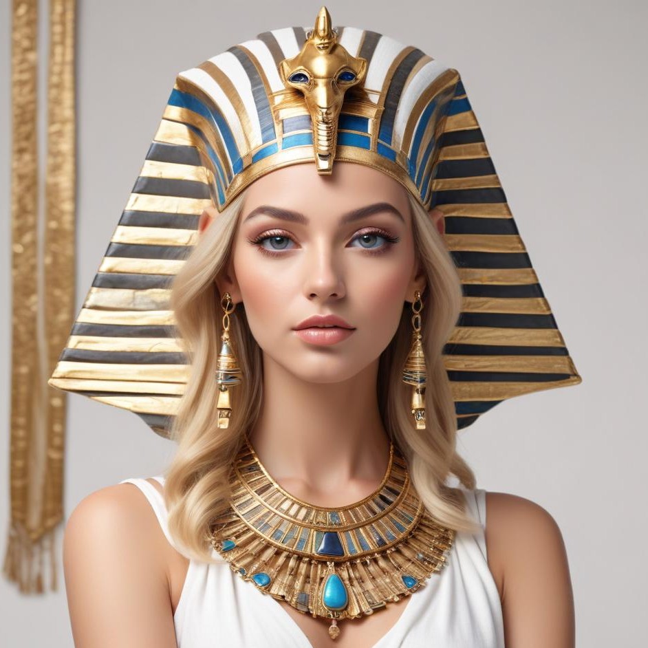 A woman dressed as an ancient pharaoh poses with a jewel-encrusted headdress and necklace in a studio setting resembling ancient Egypt.