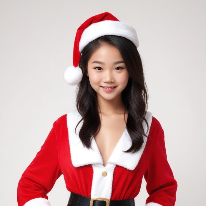 A young woman wears a red and white outfit with a Santa hat while smiling for the camera. She presents a joyful holiday spirit.