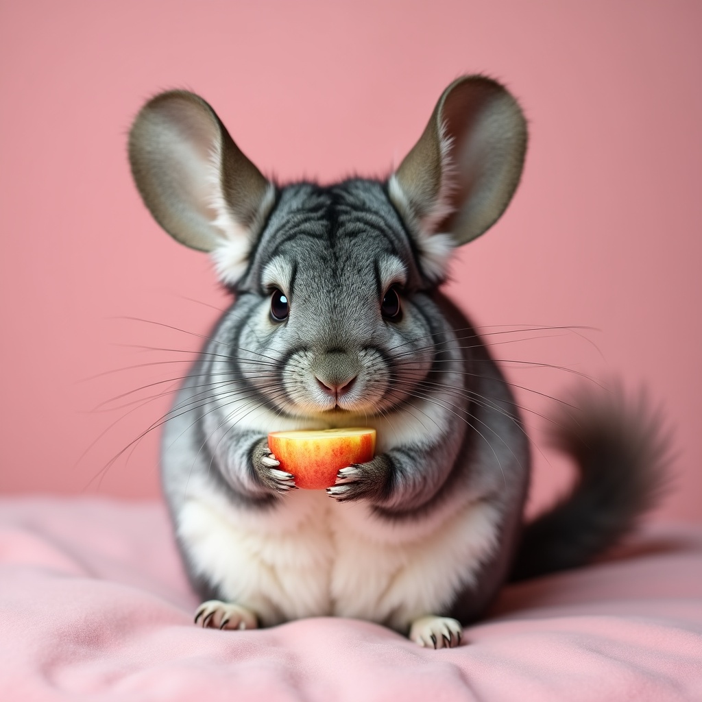 A chinchilla sits on a soft surface holding a small piece of fruit. The background is a light, plain shade.