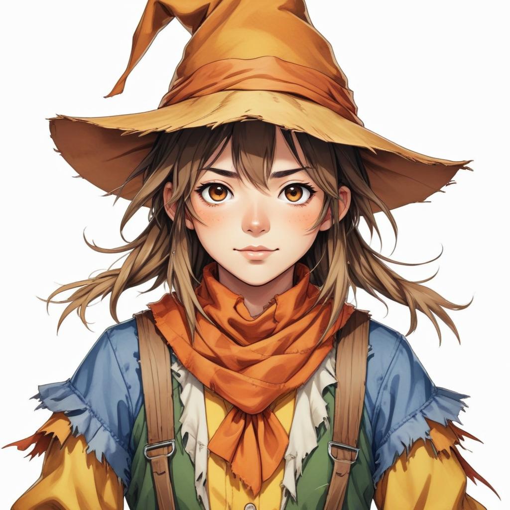 A young person wears a straw hat and orange scarf. They seem ready for outdoor work. The background is simple and not detailed.