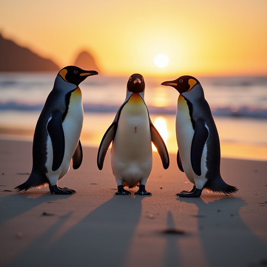 Three penguins stand together on a sandy beach during sunset. The sky glows with orange and yellow colors as waves roll in.