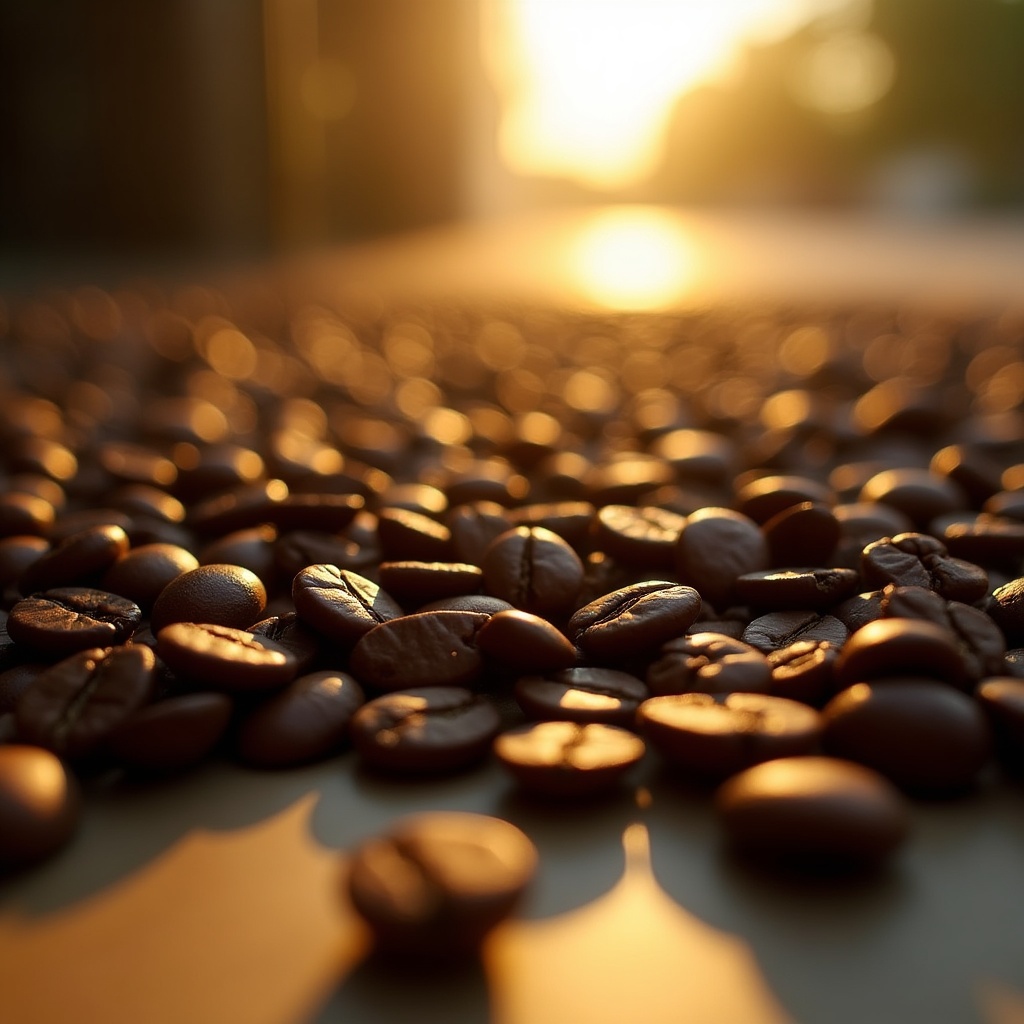 Coffee beans scattered on a surface catch the warm light of the sunset. The scene shows a close-up view with a blurred background.