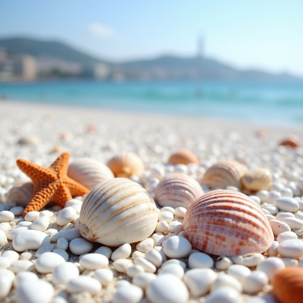 Seashells and a starfish lie on a sandy beach. The ocean waves are visible in the background. It is a sunny day.