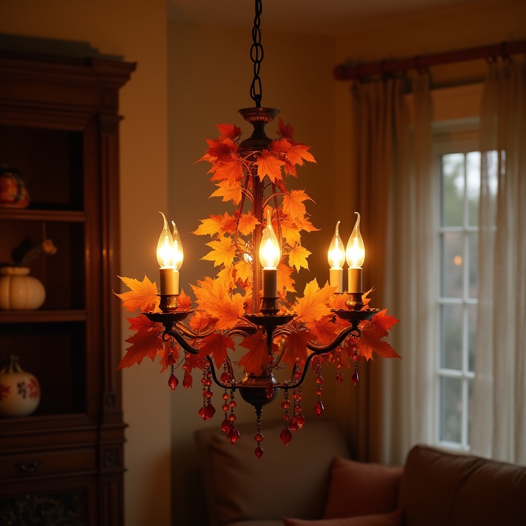 A chandelier is hanging in a room. It features orange leaves and glows with warm light. The atmosphere suggests a cozy autumn setting.