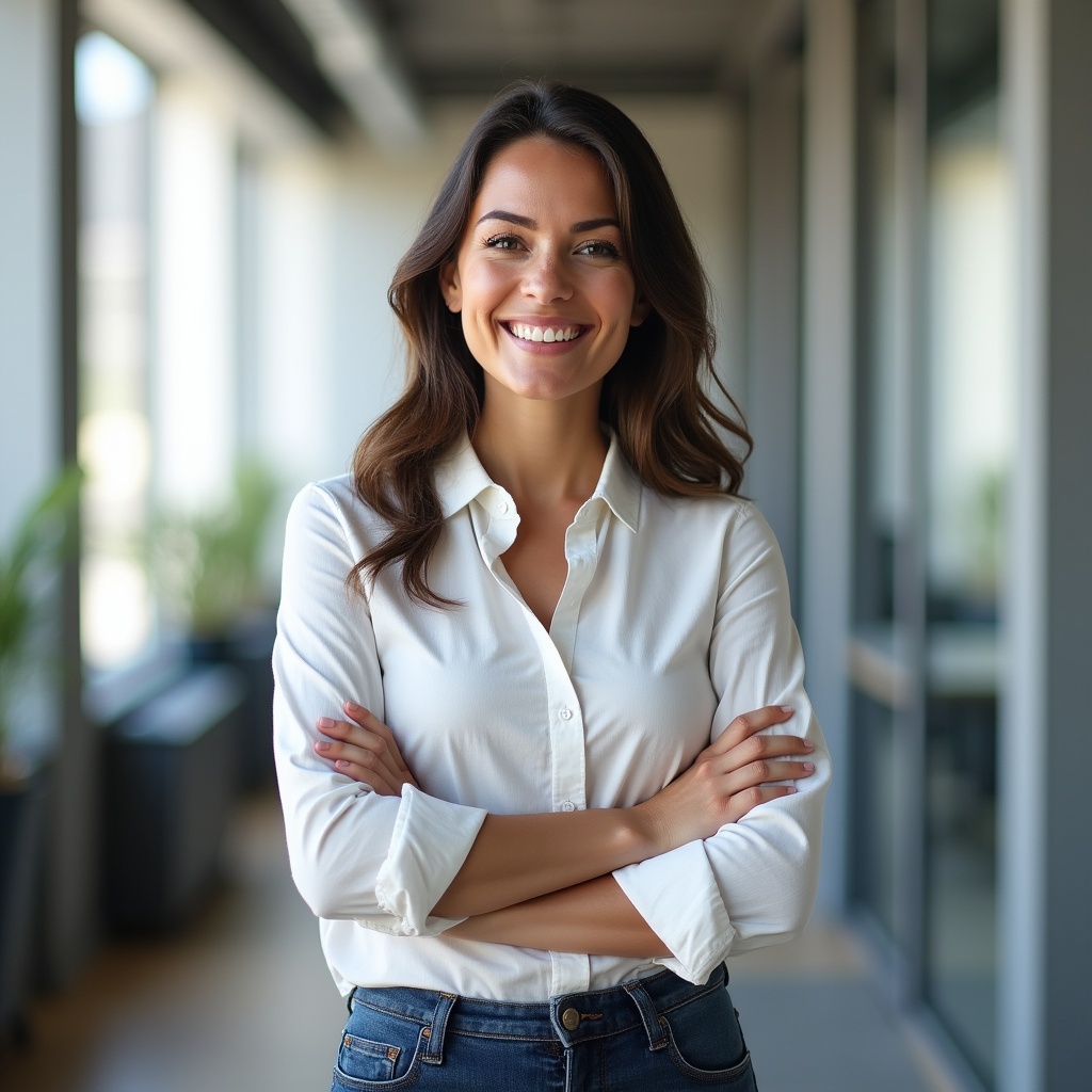 A woman stands with arms crossed, smiling in a modern office. Natural light comes through large windows, creating a bright atmosphere.