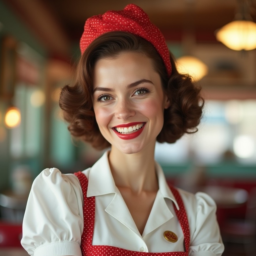 Waitress stands in a retro diner, wearing a red polka dot dress and headband. She smiles and serves customers during the day.