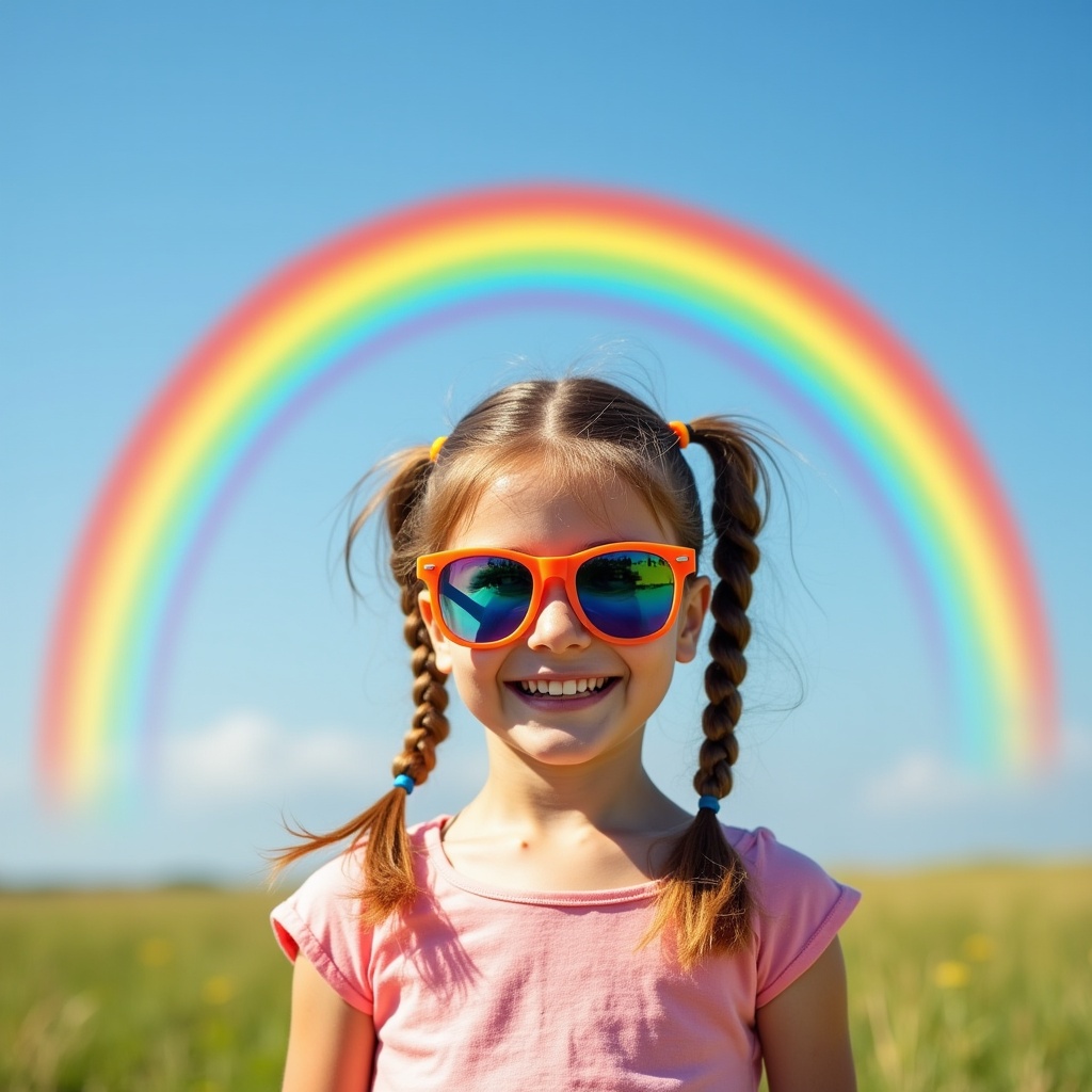 braids, bright, children, clear sky, colorful, field, fun, girl, green grass, happiness, joy, light, nature, outdoor, playful, rainbow, smile, summer, sunglasses, sunny