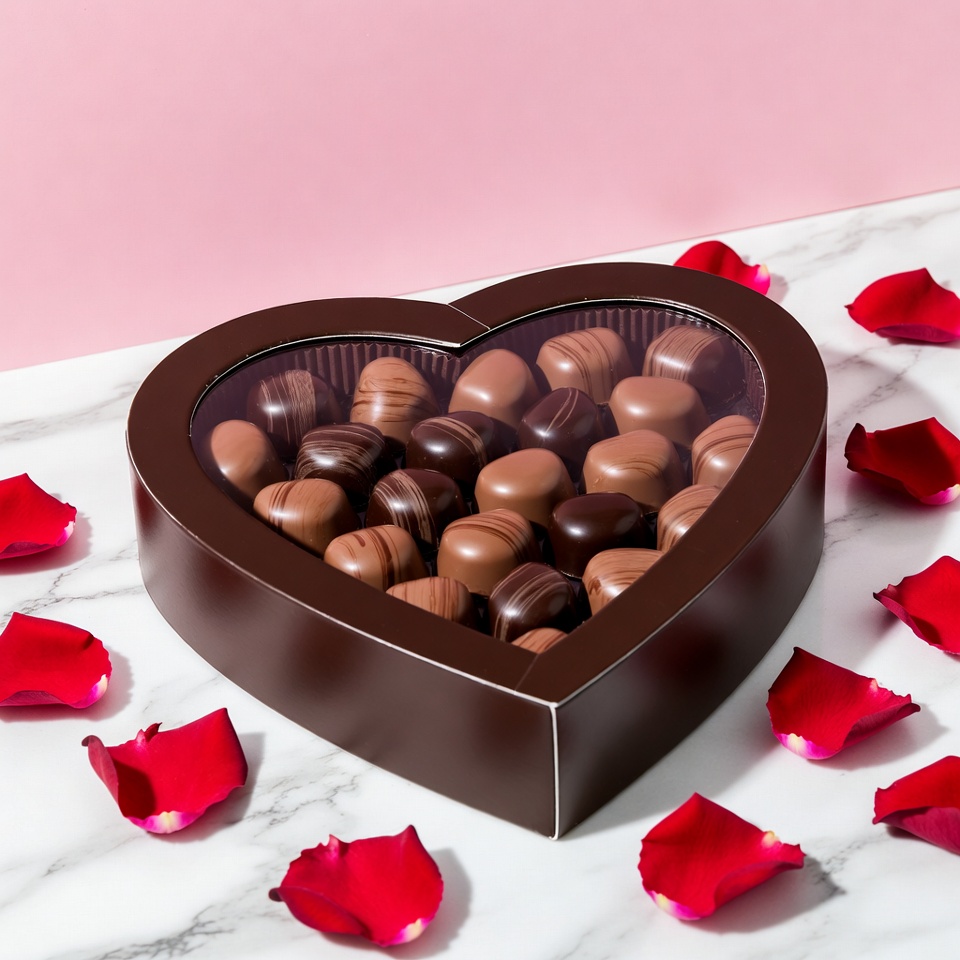Heart-shaped box holds various chocolates. Red rose petals surround it on a marble surface with a light pink background.