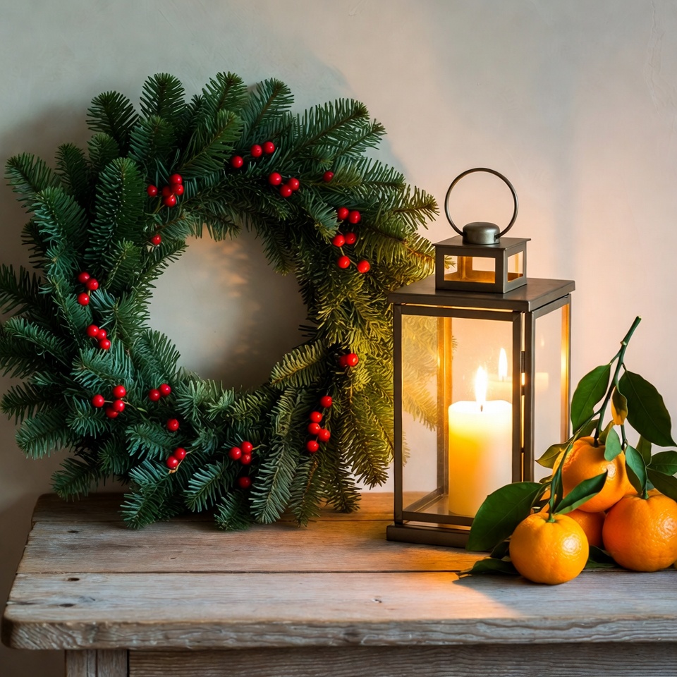 A green wreath with red berries sits beside a lantern and a candle on a wooden table. Oranges are placed next to the lantern.