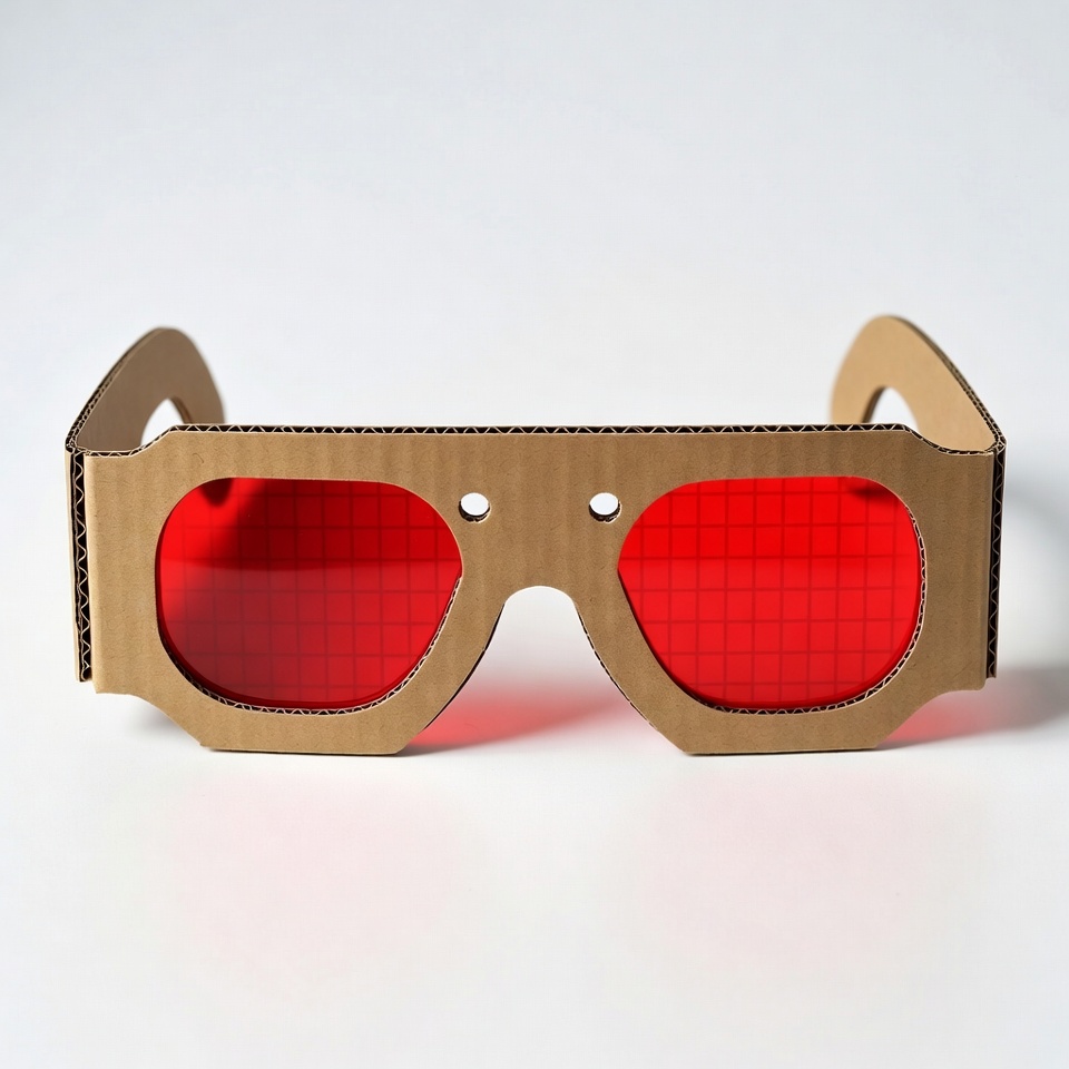 Cardboard glasses with red lenses sit on a plain surface. They are made from simple materials and have a geometric design.