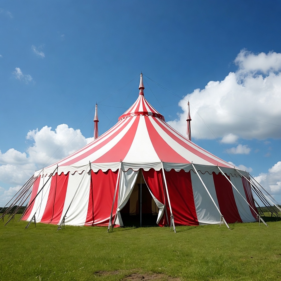 A large red and white circus tent is set up on green grass under a blue sky with clouds. It is prepared for an event happening soon.