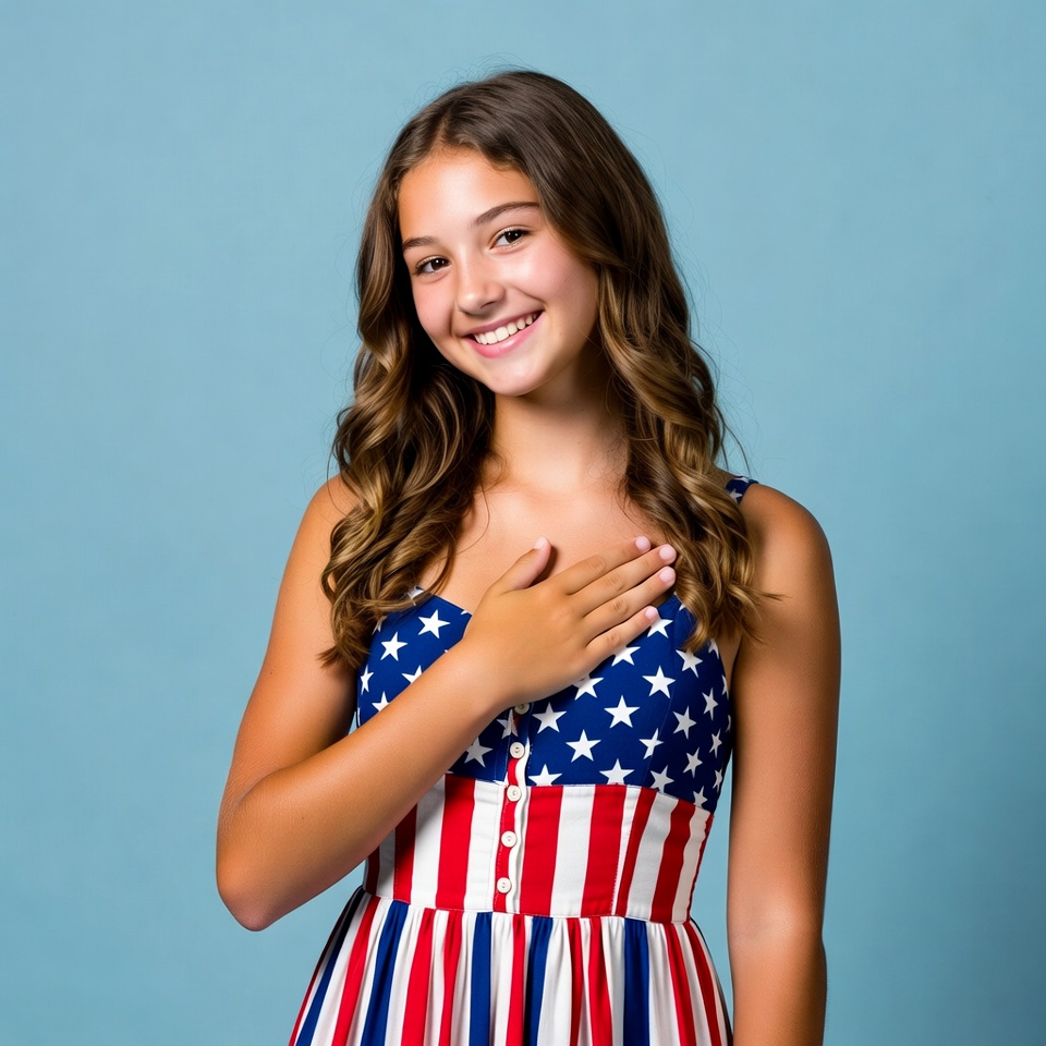 attire, blue background, celebration, cheerful, confidence, dress, emotion, fashion, gesture, girl, happiness, innocence, patriotism, portrait, smiling, stars, stripes, style, teen, youth