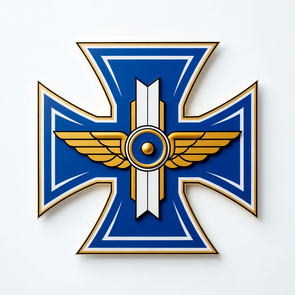 artwork, aviation, blue, bold, colors, craft, creative, decoration, design, display, emblem, geometric, gold, graphic, icon, style, symbol, wall, white, winged