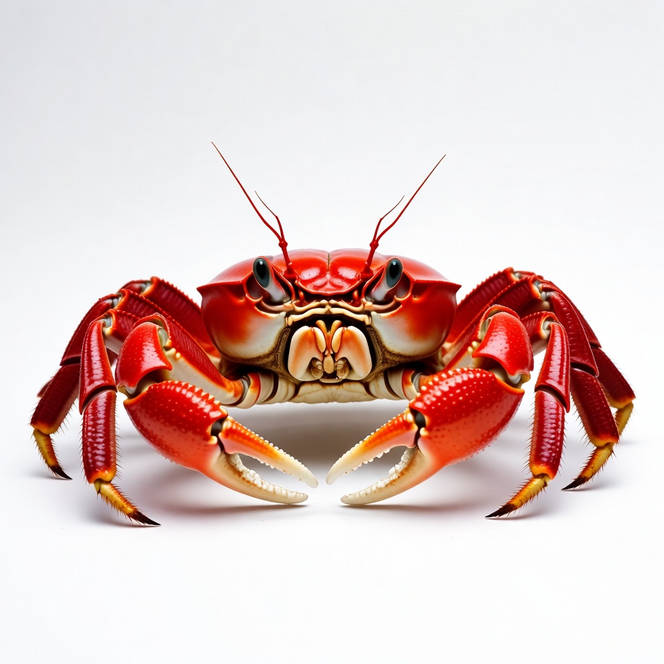 Red crab with large claws on white surface