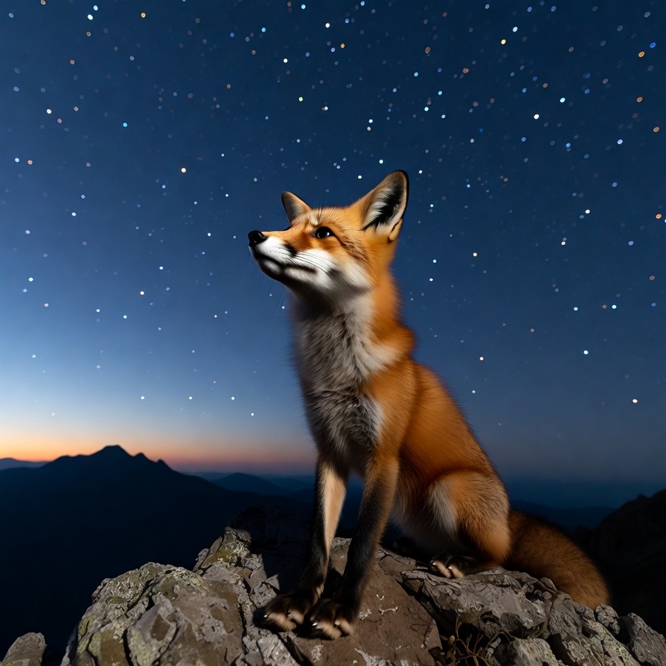 A fox sits on a rocky surface under a starry sky during twilight. The scene shows the animal looking towards the horizon.