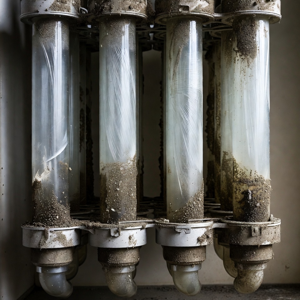 Four dusty tubes show years of neglect in an abandoned setting. The tubes are filled with dirt and grime, highlighting decay over time.