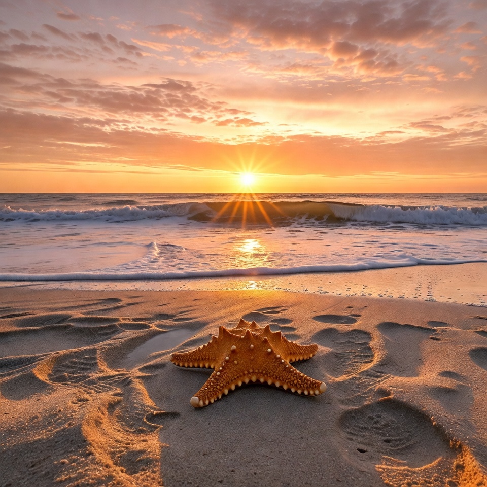 A starfish rests on wet sand as the sun sets over the ocean. Waves gently roll in, and the sky shows warm colors.