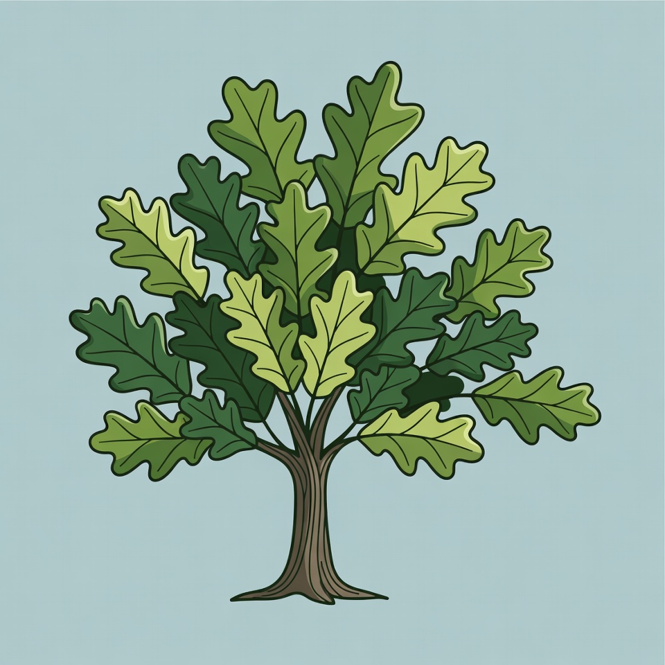 An oak tree with various shades of green leaves stands against a light blue background, showcasing a simple and clear design.