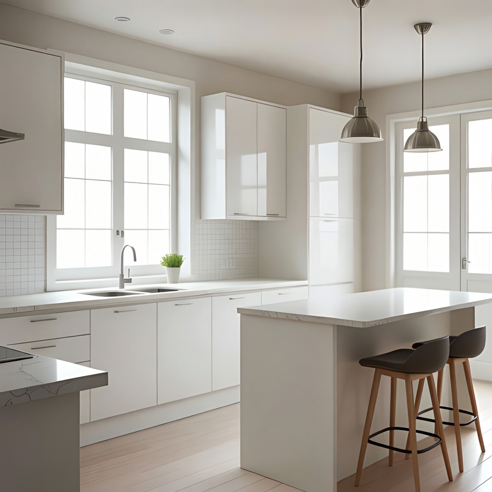 appliances, bright, clean, cooking area, countertop, day, decoration, furniture, home, interior design, kitchen, modern style, natural light, organization, pantry, simplicity, sink, stools, white cabinets, windows