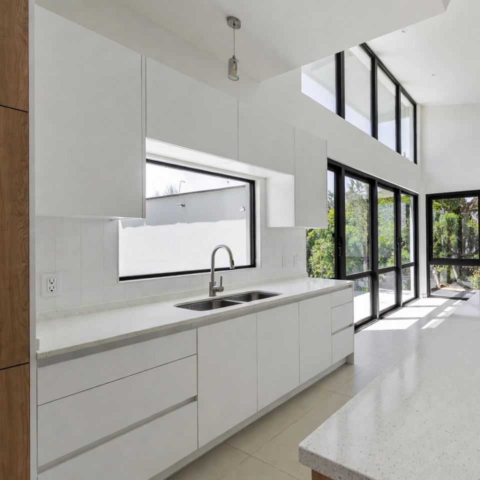 Bright kitchen with white cabinets and a large window. Natural light fills the space, highlighting the clean lines and simple design.