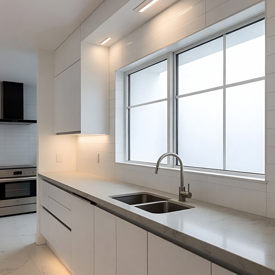 appliances, bright, cabinets, clean, cooking, countertop, design, home, interior, kitchen, minimalism, modern, natural light, renovation, sink, space, stainless steel, storage, style, window