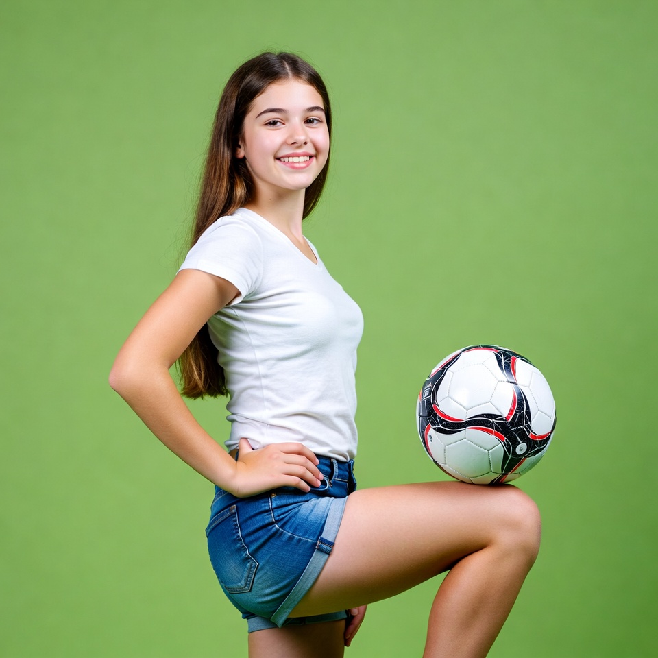 A girl stands with one leg raised, balancing a soccer ball on her knee. She smiles against a green background.