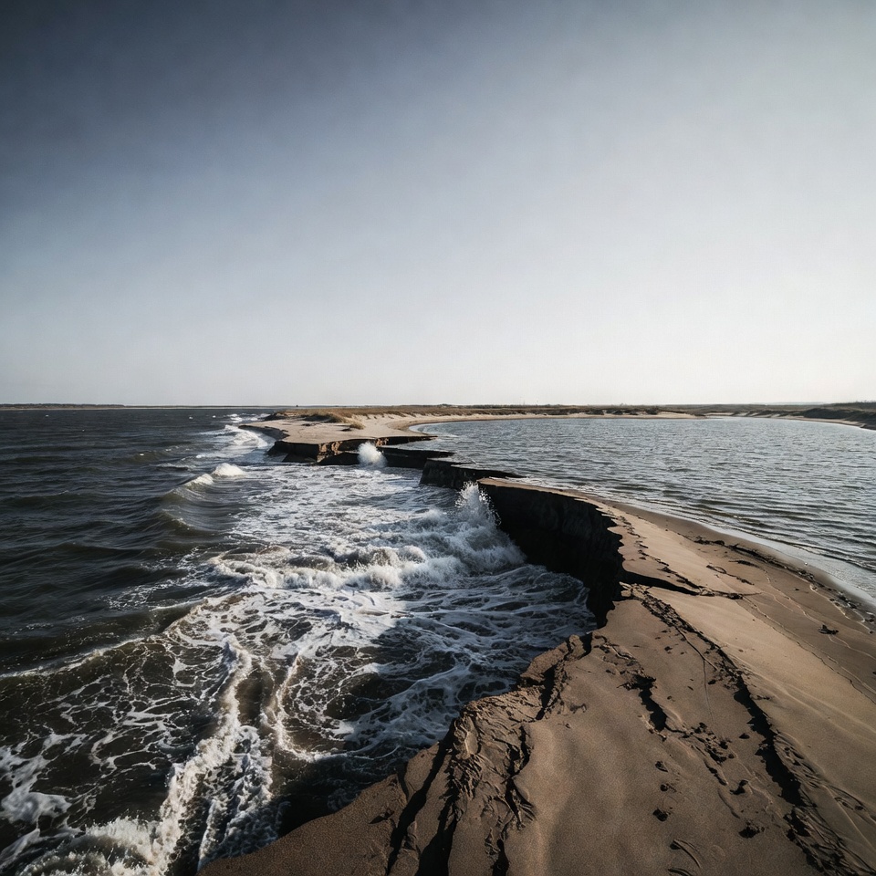 Waves crash against a sandy shore under a clear sky. The scene shows land meeting water in a coastal area during daylight.