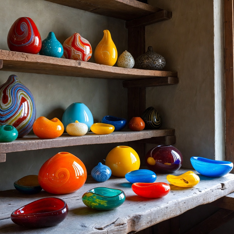 art, bright, collection, colorful, craftsmanship, decor, decoration, design, display, glass, glassmaking, handblown, interior, objects, rustic, shapes, shelves, sizes, vases, wooden