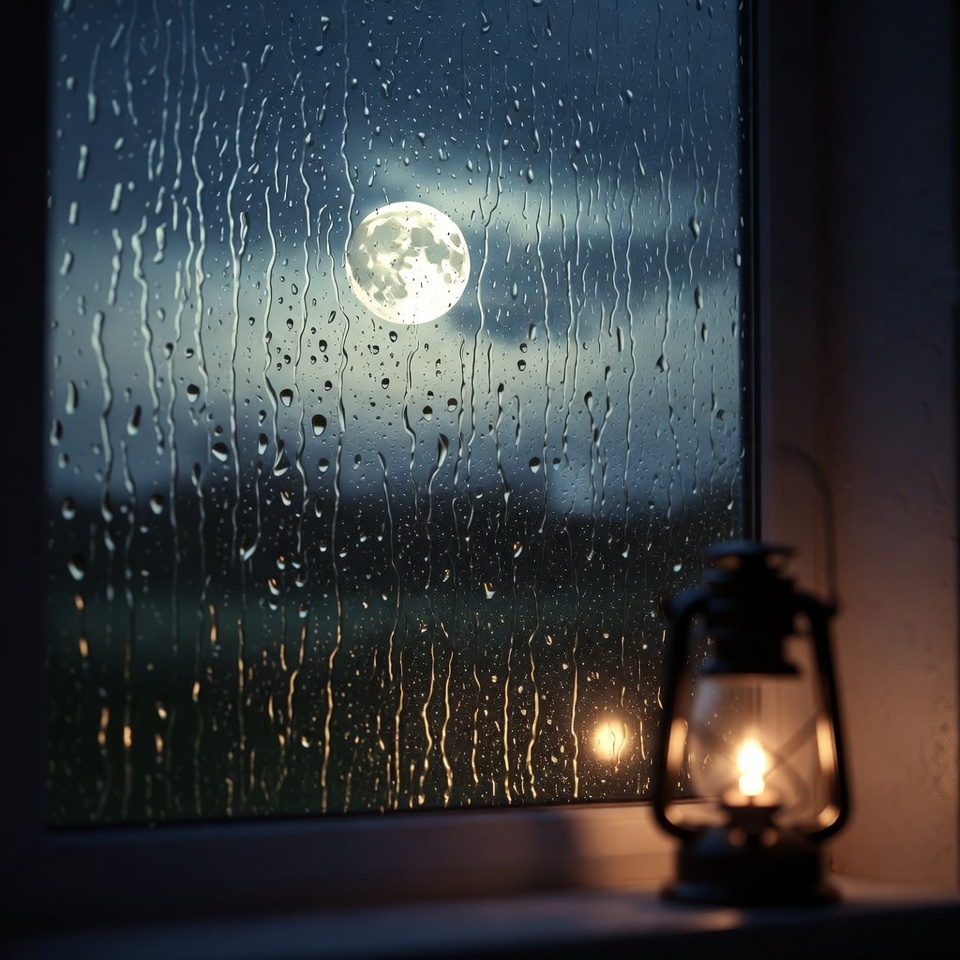 Water droplets cover the window as the full moon shines bright. A lantern on the table adds warmth to the dark room at night.