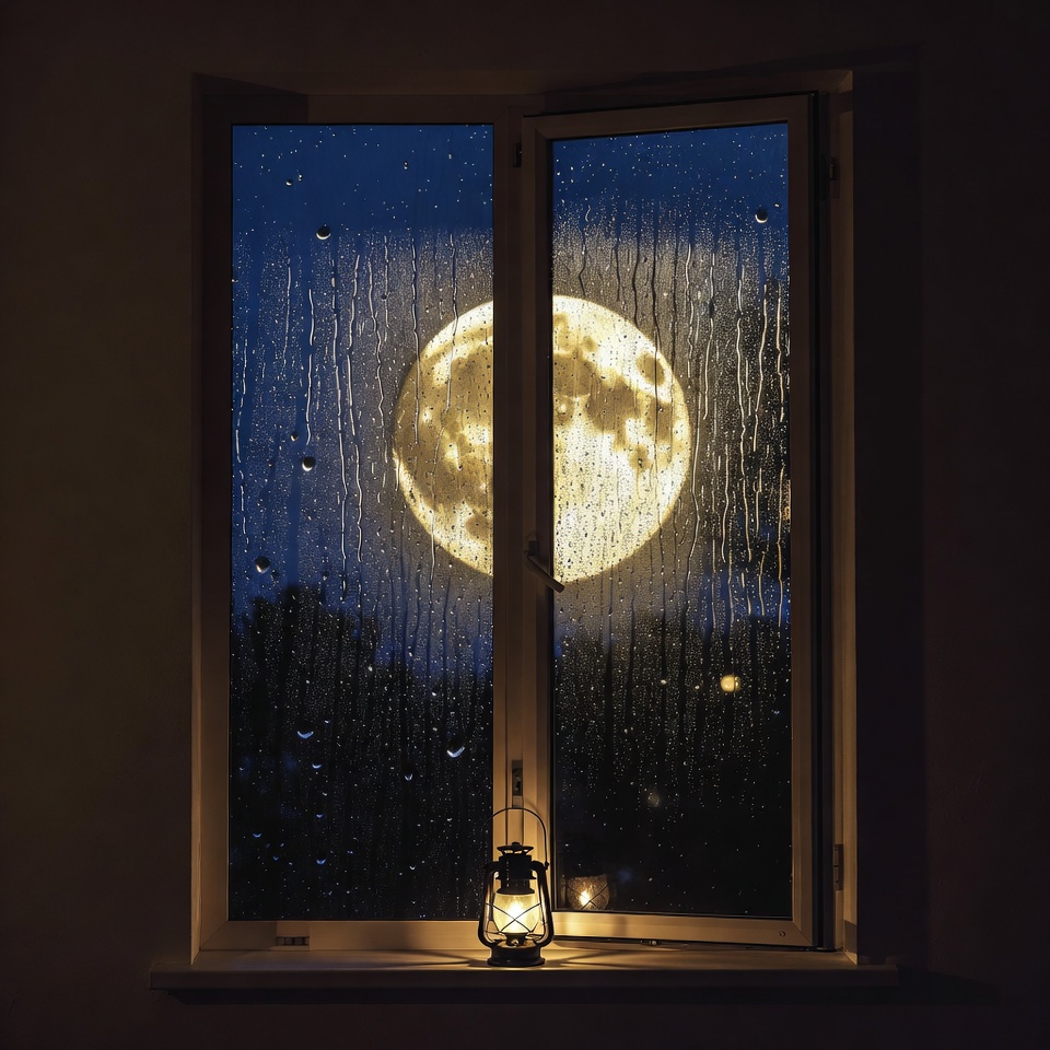 A full moon lights up the night sky outside a window. Rain droplets are on the glass, creating a blurred view. A lantern glows nearby.