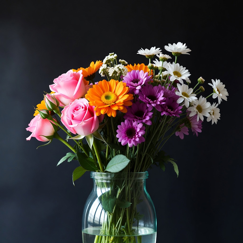 arrangement, bouquet, celebration, colors, daisies, decoration, floral, flowers, garden, gerbera, gift, glass, greenery, home, nature, petals, roses, still life, vase, water