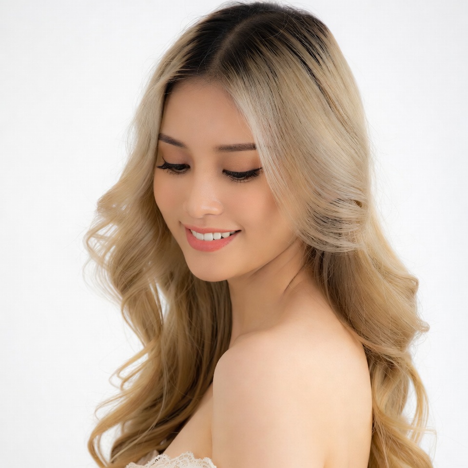 A woman is smiling gently while looking down. Her long hair flows naturally around her shoulders in a relaxed setting.