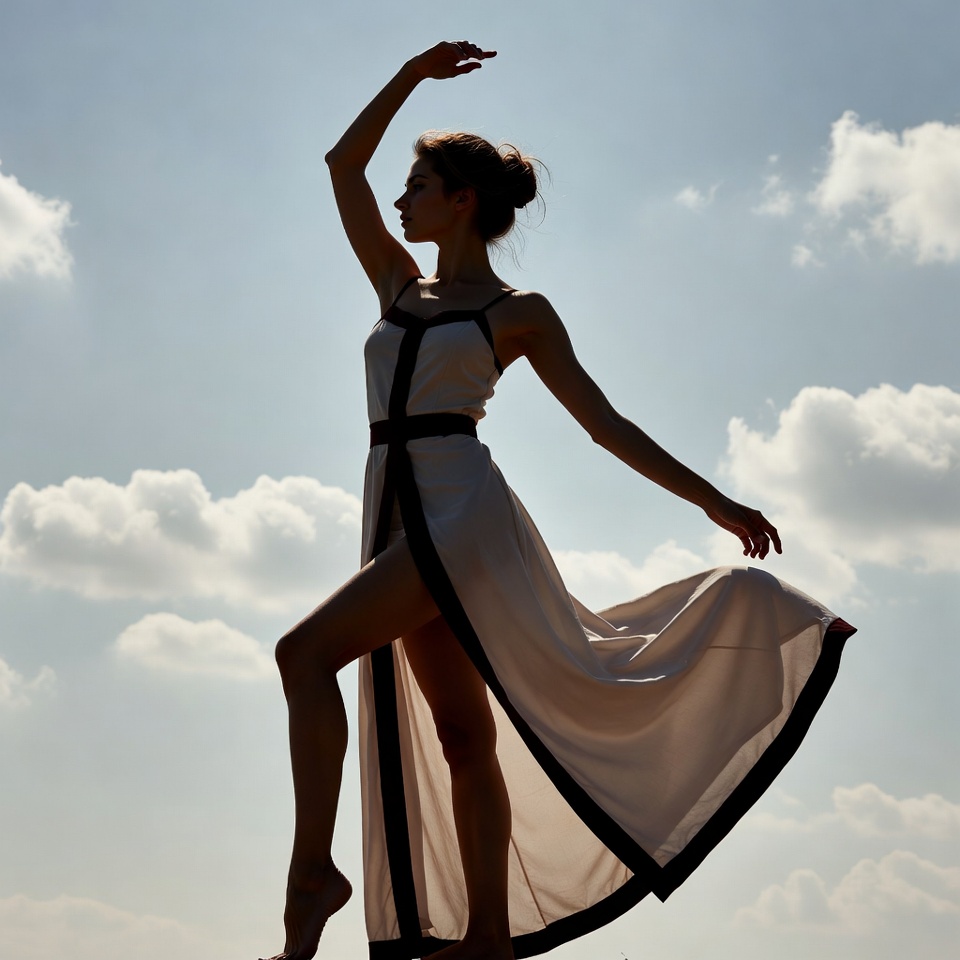 A woman dances gracefully under a bright sky with clouds. She wears a long dress and poses with one arm raised. The sunlight creates a silhouette.
