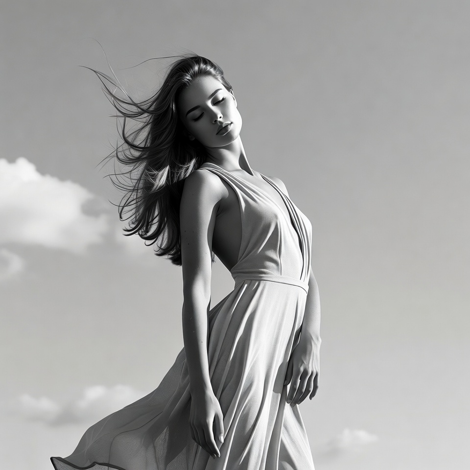 artistry, beauty, clouds, dress, elegance, fashion, hair, model, monochrome, movement, nature, outdoor, posing, silhouette, sky, style, summer, sunlight, wind, woman