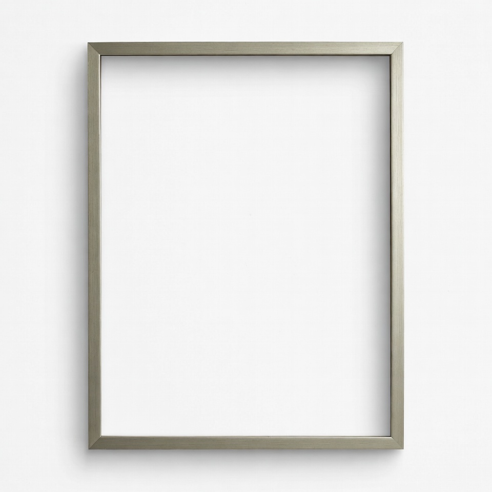 An empty frame is placed against a plain white wall. The frame has a simple design and is ready for artwork or photos.