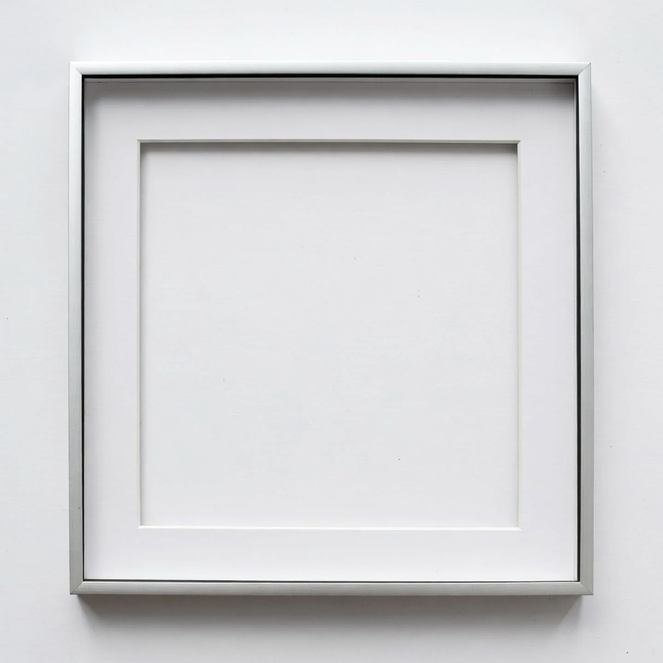 A clean, empty frame hangs on a white wall. It is simple and lacks any artwork inside. The focus is on the frame's design.