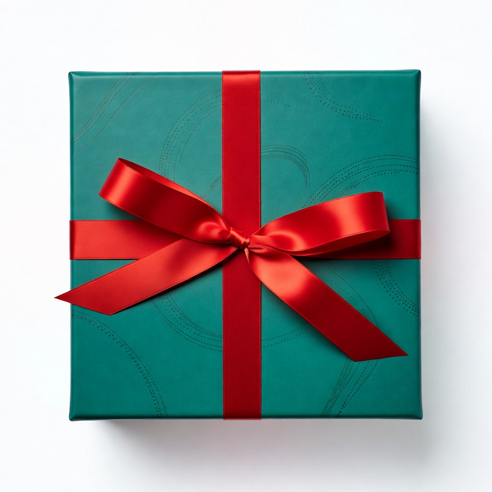 A green gift box with a red ribbon sits on a white surface. This box is wrapped neatly for a special occasion or celebration.