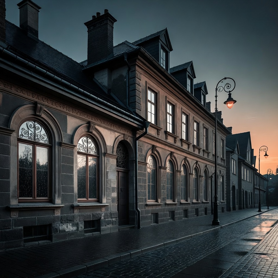 Street lined with old buildings shows light from windows as night falls. Streetlamps glow softly along the wet cobblestones.