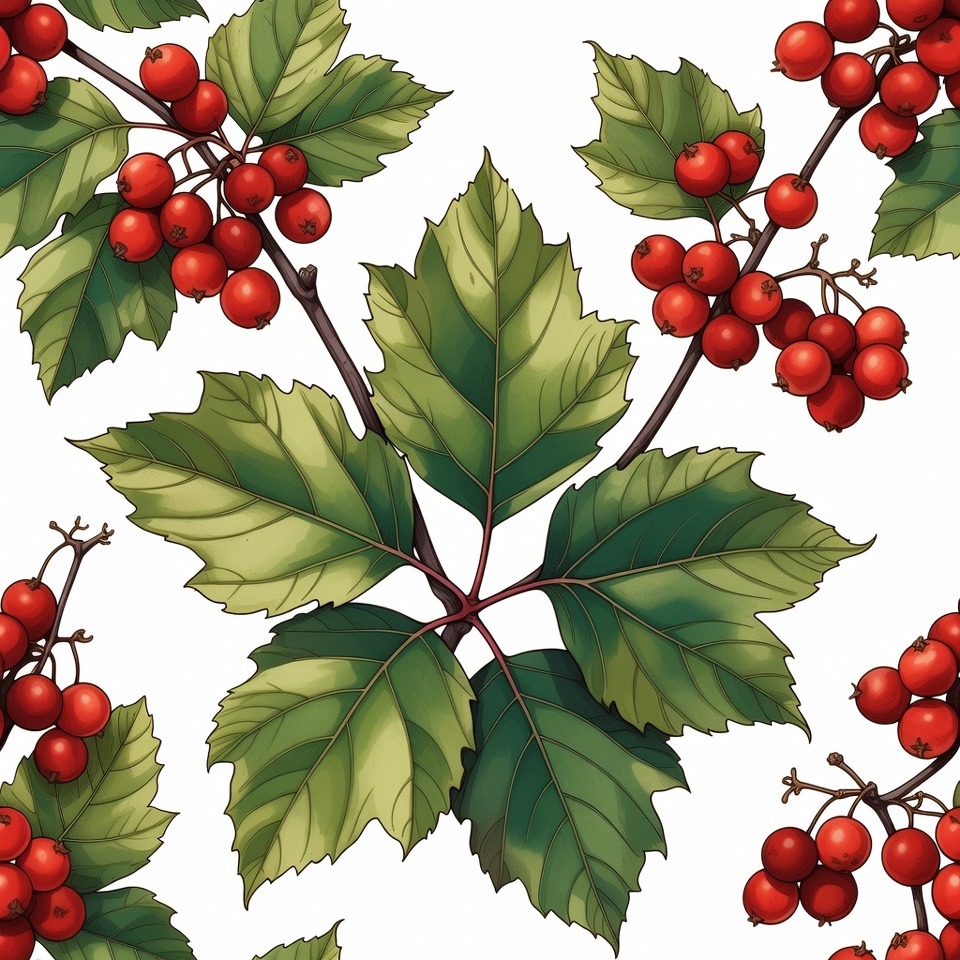 aesthetic, artwork, botanical, branch, decoration, design, detail, flora, fruit, graphic, green leaves, illustration, leaves, nature, pattern, plant, red berries, seamless, textile, wallpaper