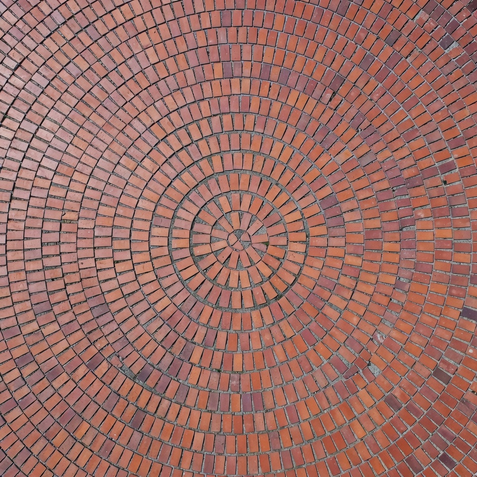 architecture, bricks, circular design, construction, details, floor, geometric, ground, landscaping, materials, outdoor, pattern, pavement, red bricks, site, spiral, surface, symmetry, texture, urban