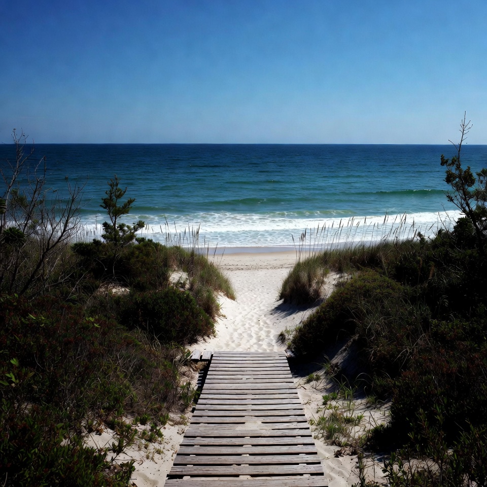 A wooden path leads through grass and shrubs to a sandy beach with blue waves rolling in under a clear sky.