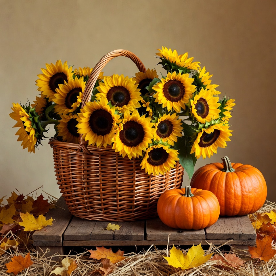 A basket filled with sunflowers sits among pumpkins and autumn leaves. The scene shows a harvest display in a warm indoor setting.