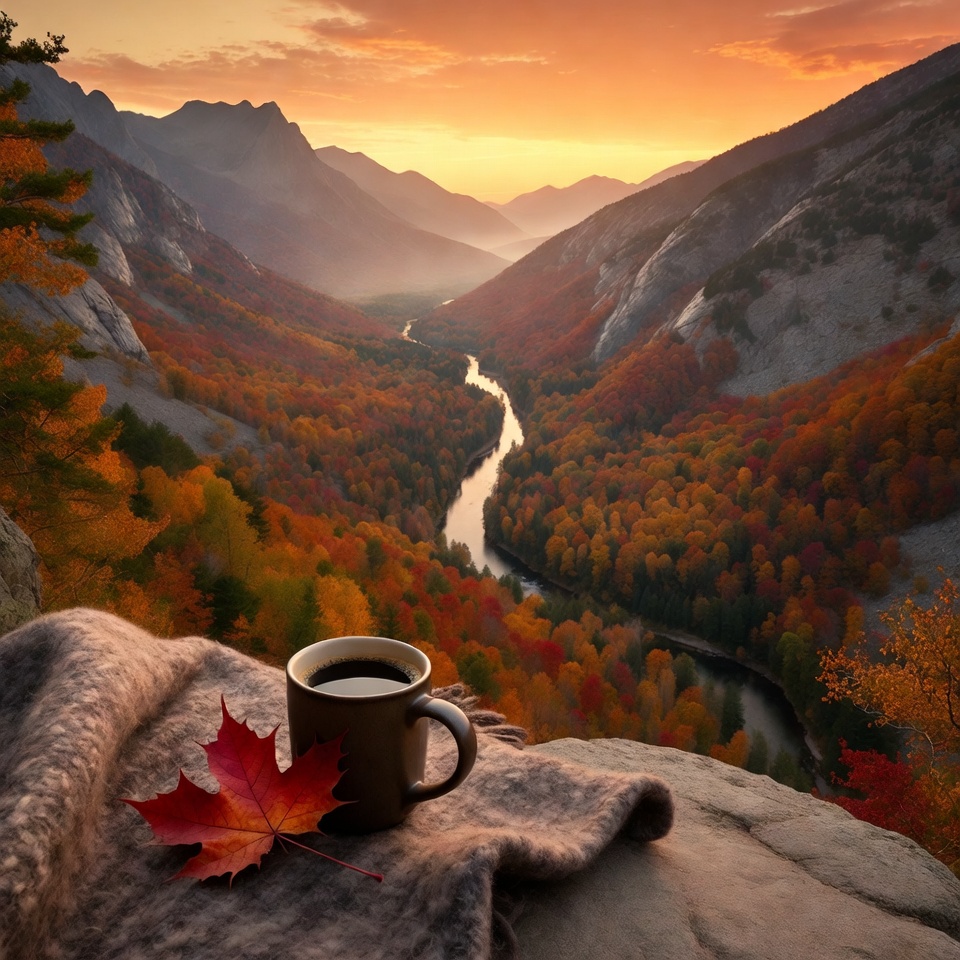 A cup of coffee rests on a blanket near a river surrounded by mountains. The scene shows colorful trees in the sunset sky.