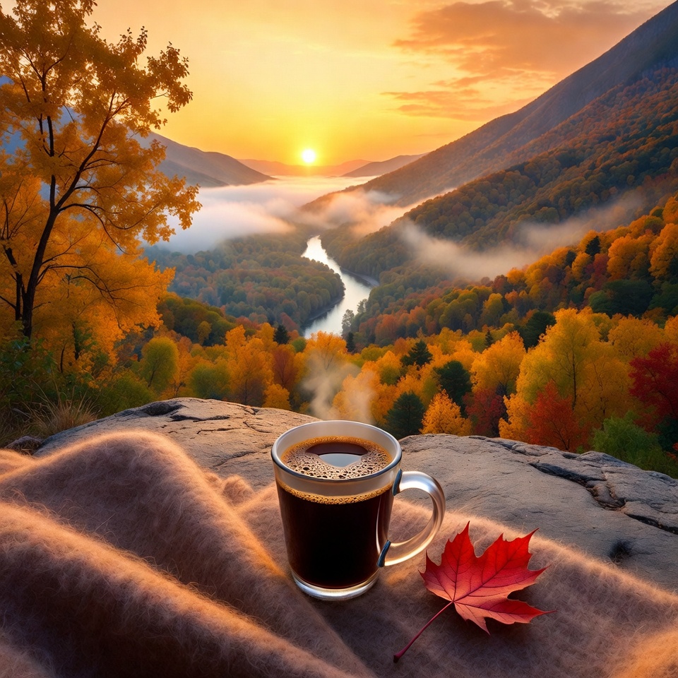 autumn, coffee, cup, foliage, hot drink, landscape, mist, morning, mountain, nature, outdoor, peaceful moment, reflections, river, scenery, steam, sunrise, trees, valley, warmth