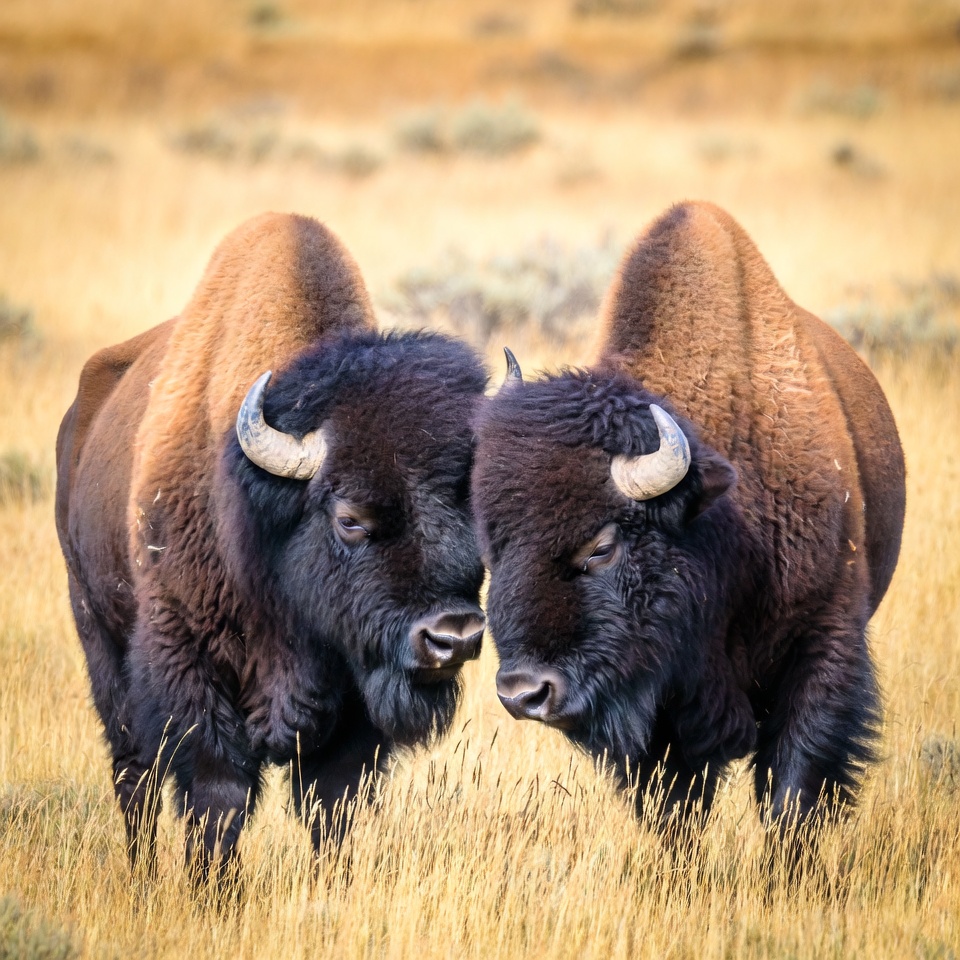 Two bison stand close together in a grassy field. They approach each other in a natural habitat during a sunny day.