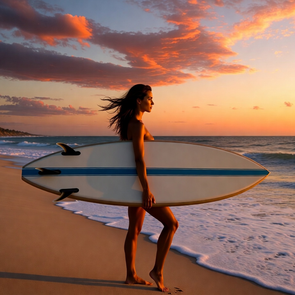 activity, beach, coastline, evening, girl, horizon, nature, ocean, outdoor, sand, sea, shore, silhouette, sky, sports, sunset, surfboard, water, waves, woman