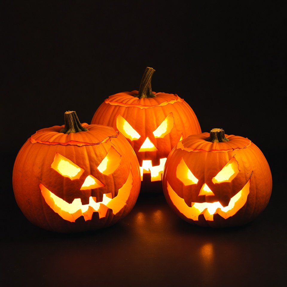 Three carved pumpkins are lit from inside, showcasing their spooky faces. They sit against a dark background, creating a festive Halloween vibe.