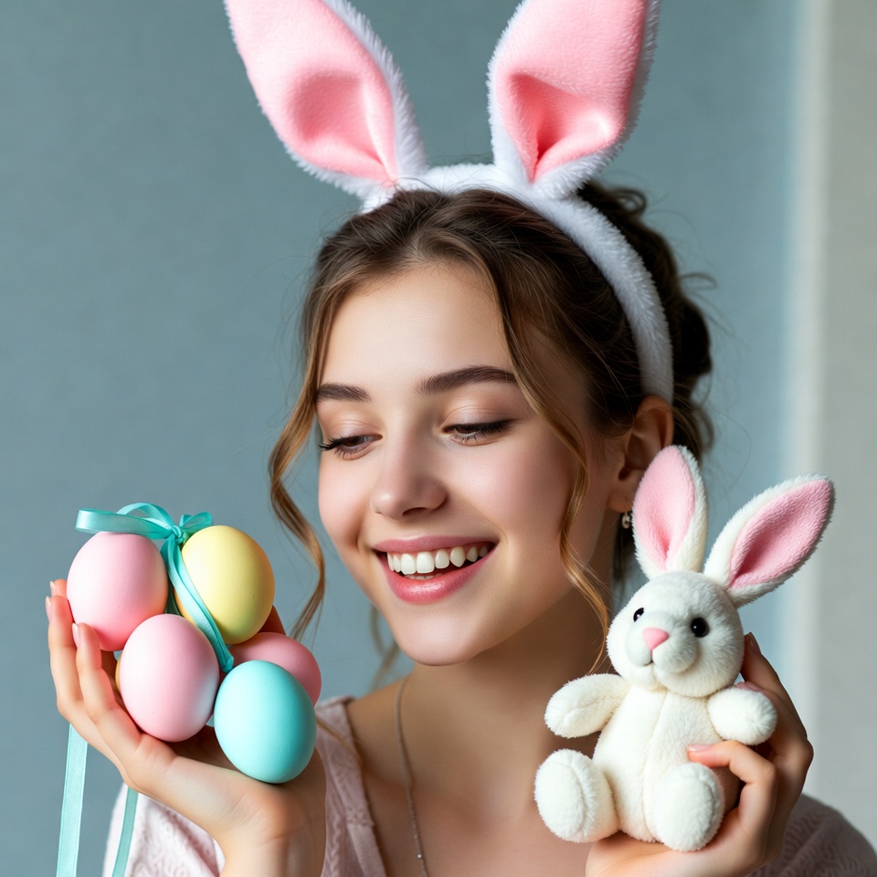A girl holds colorful Easter eggs and a plush bunny, smiling. She wears bunny ears and enjoys the festive atmosphere during Easter time.